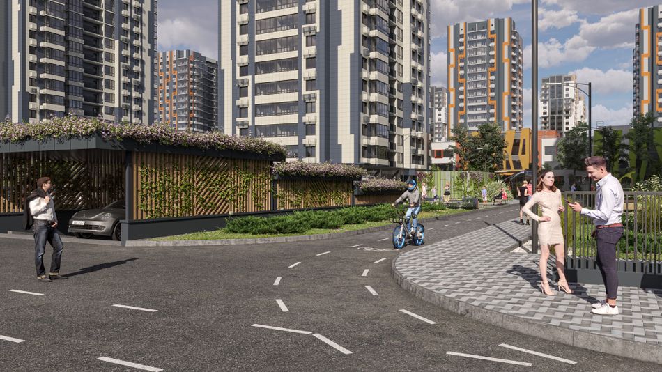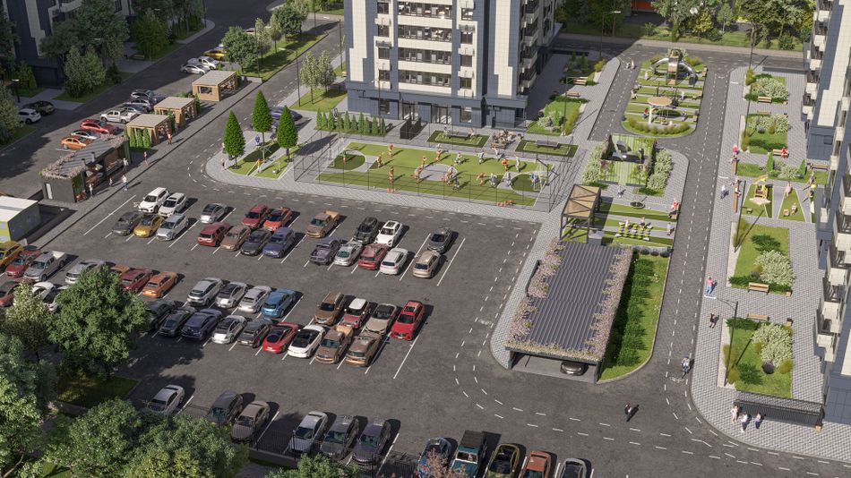 Три 25-ти этажных дома с благоустроенной территорией и многоуровневым паркингом для автомобилей.