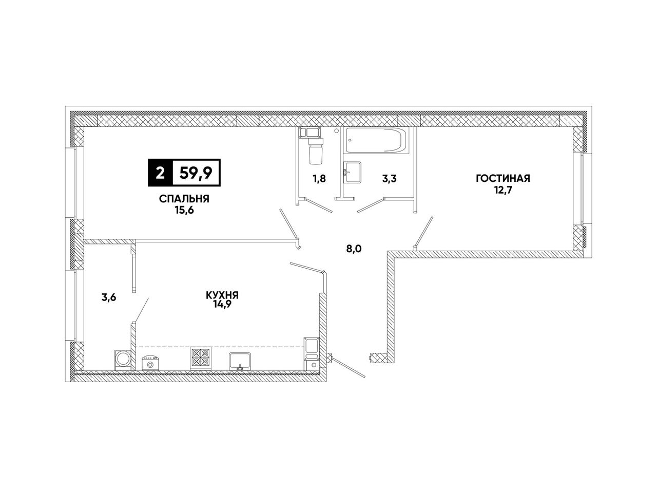 2-комнатная — 59,9 м² 3/12 эт. в Кварталы 17/77