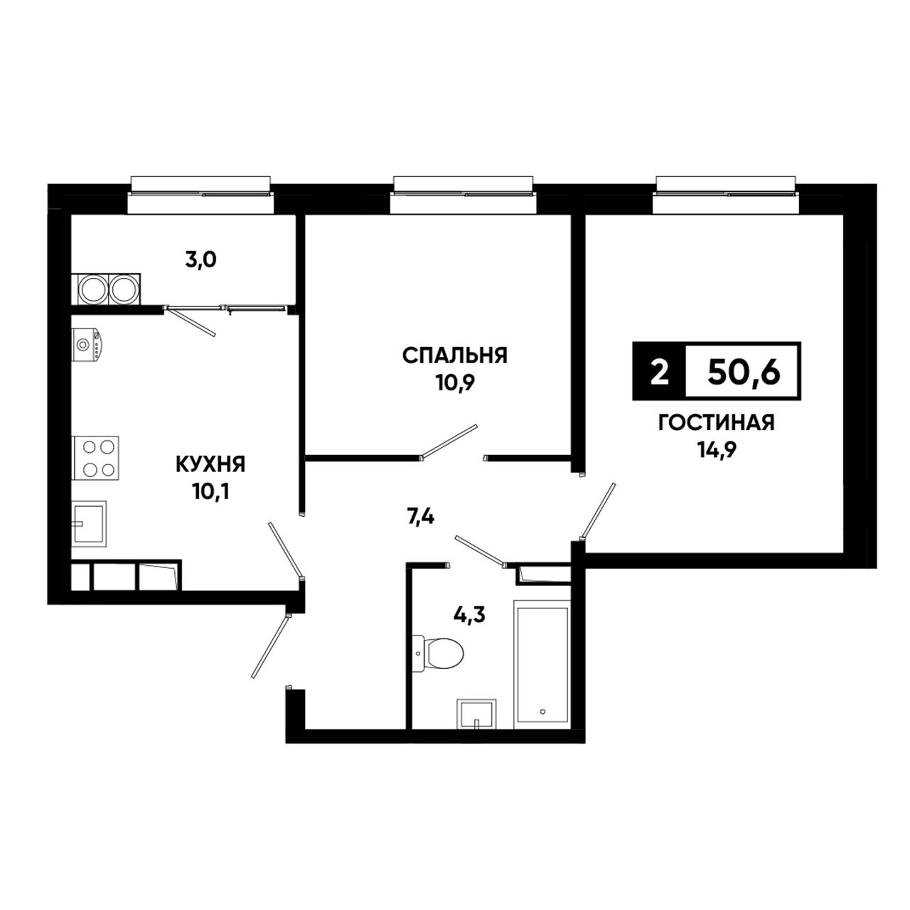 2-комнатная — 50,6 м² 14/19 эт. в Основа