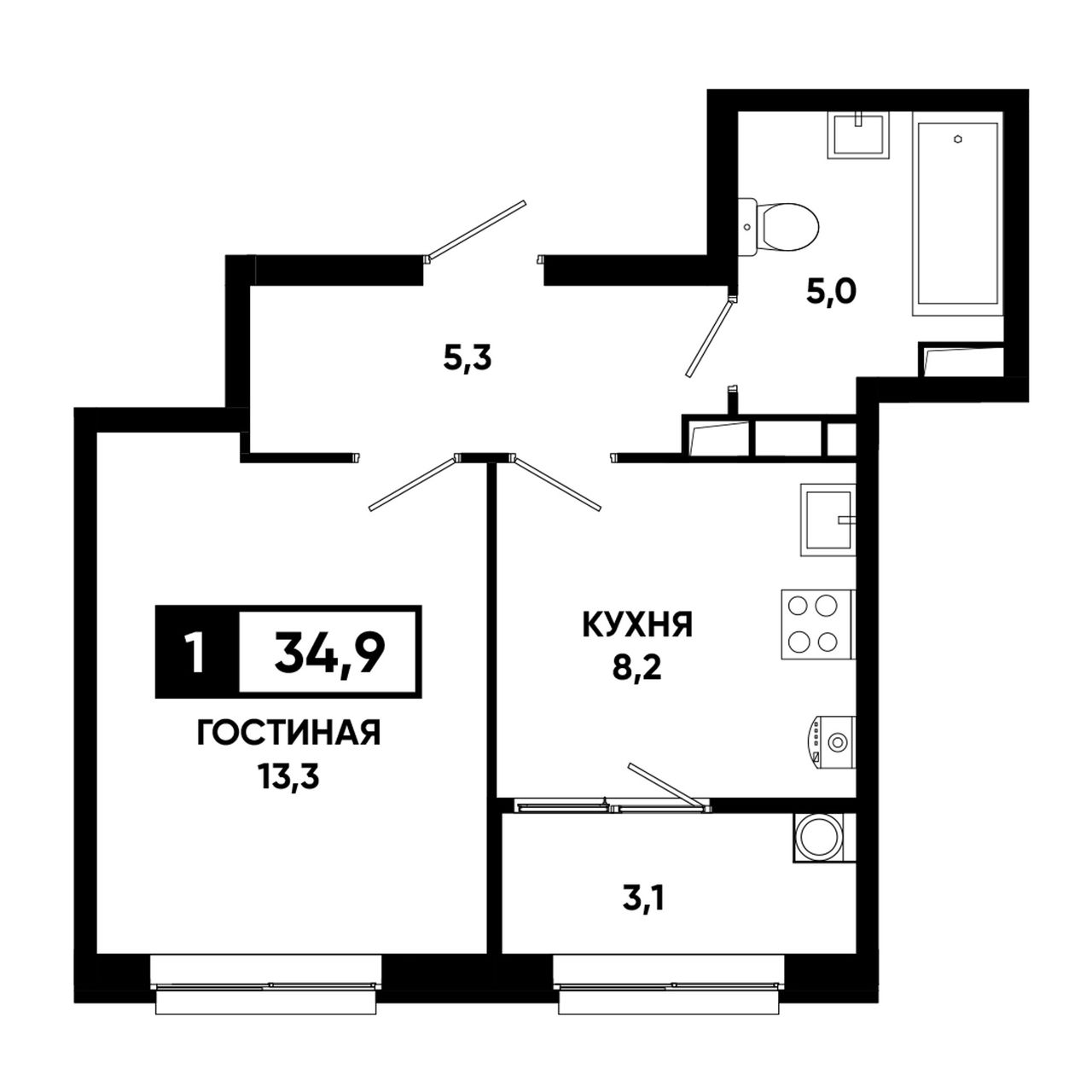 1-комнатная — 34,9 м² 12/19 эт. в Основа
