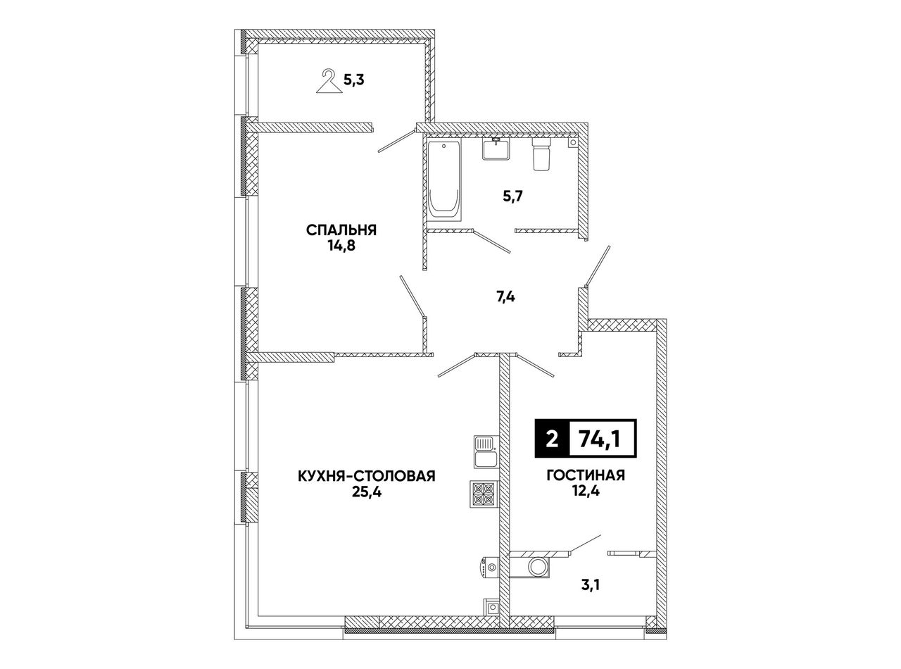 1-комнатная — 74,1 м² 2/16 эт. в Кварталы 17/77