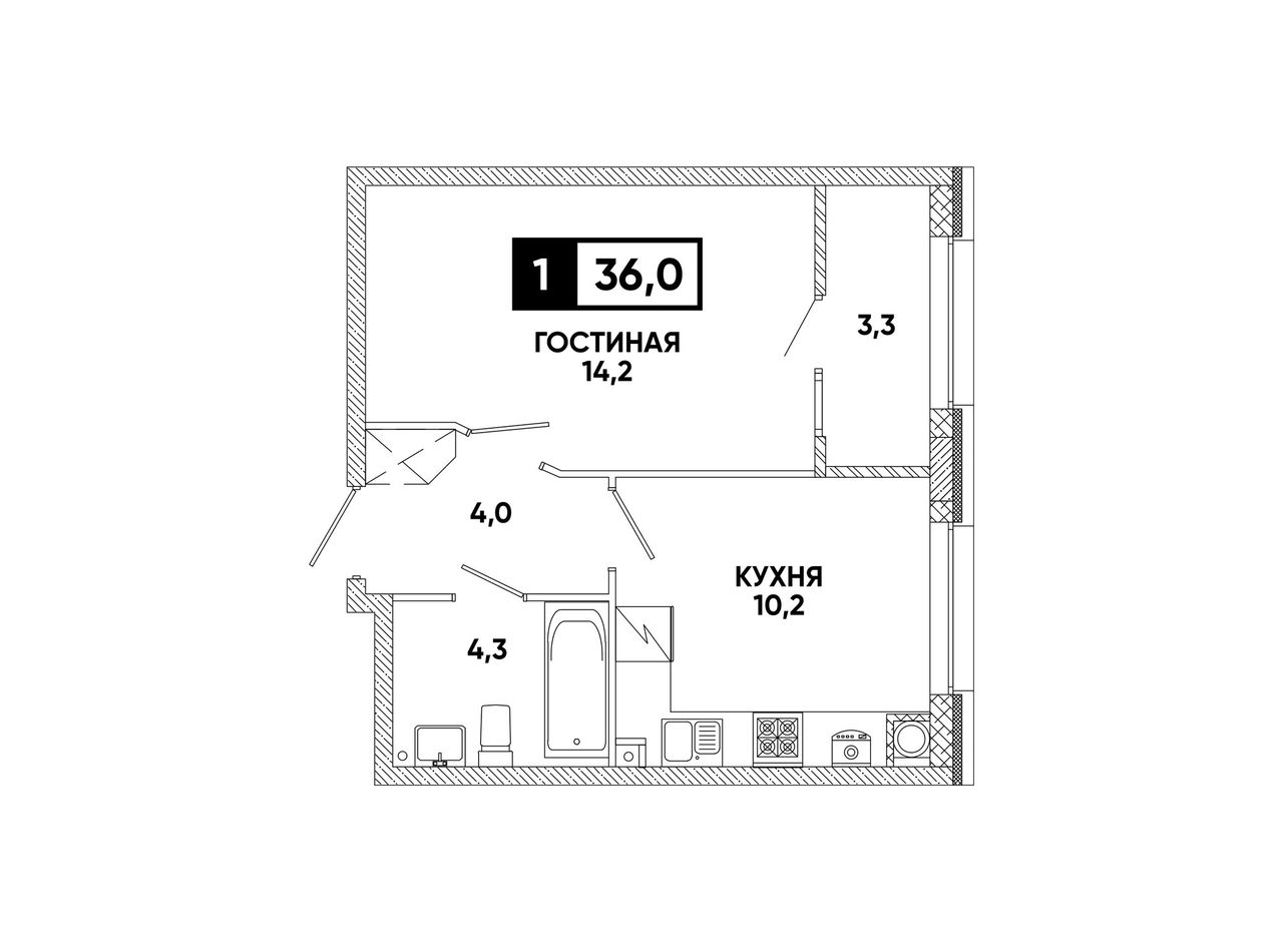 1-комнатная — 36 м² 2/16 эт. в Кварталы 17/77