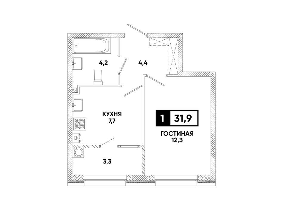 1-комнатная — 31,9 м² 2/12 эт. в Кварталы 17/77