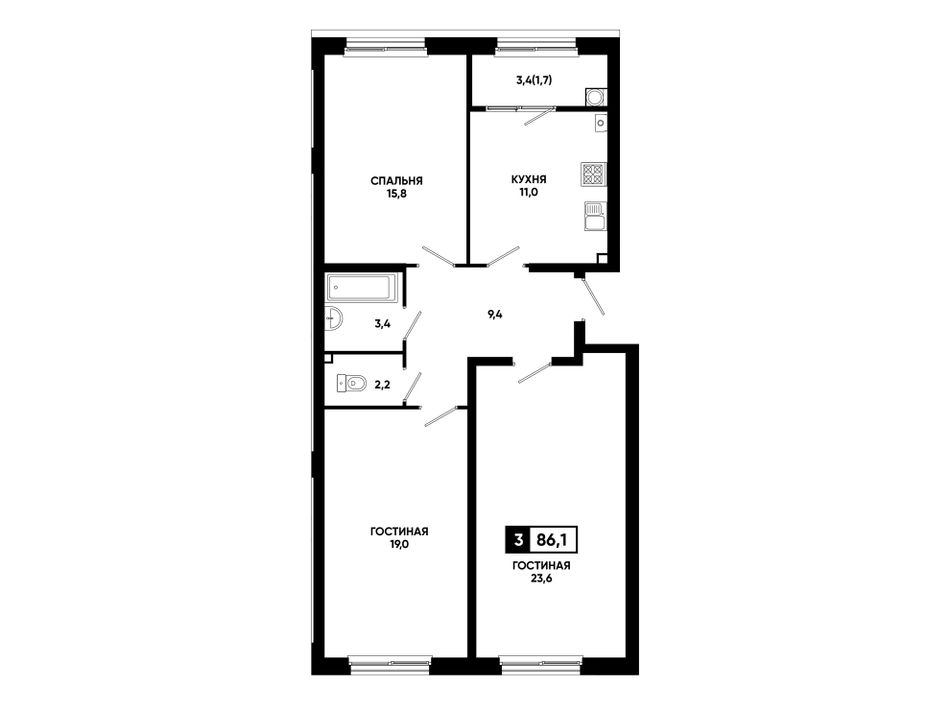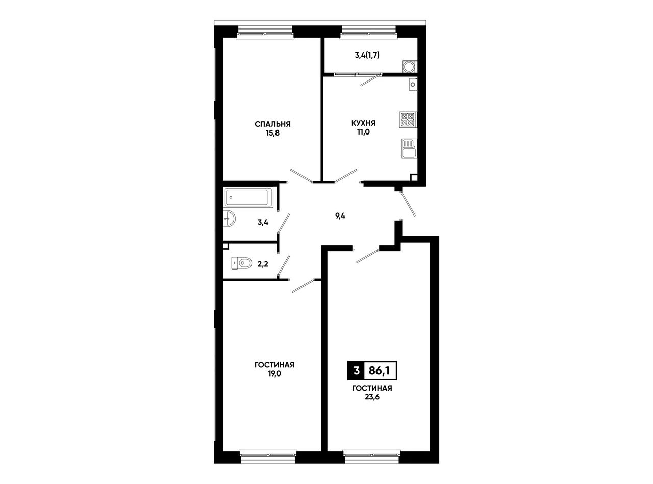 3-комнатная — 86,1 м² 2/24 эт. в Резиденция Софи