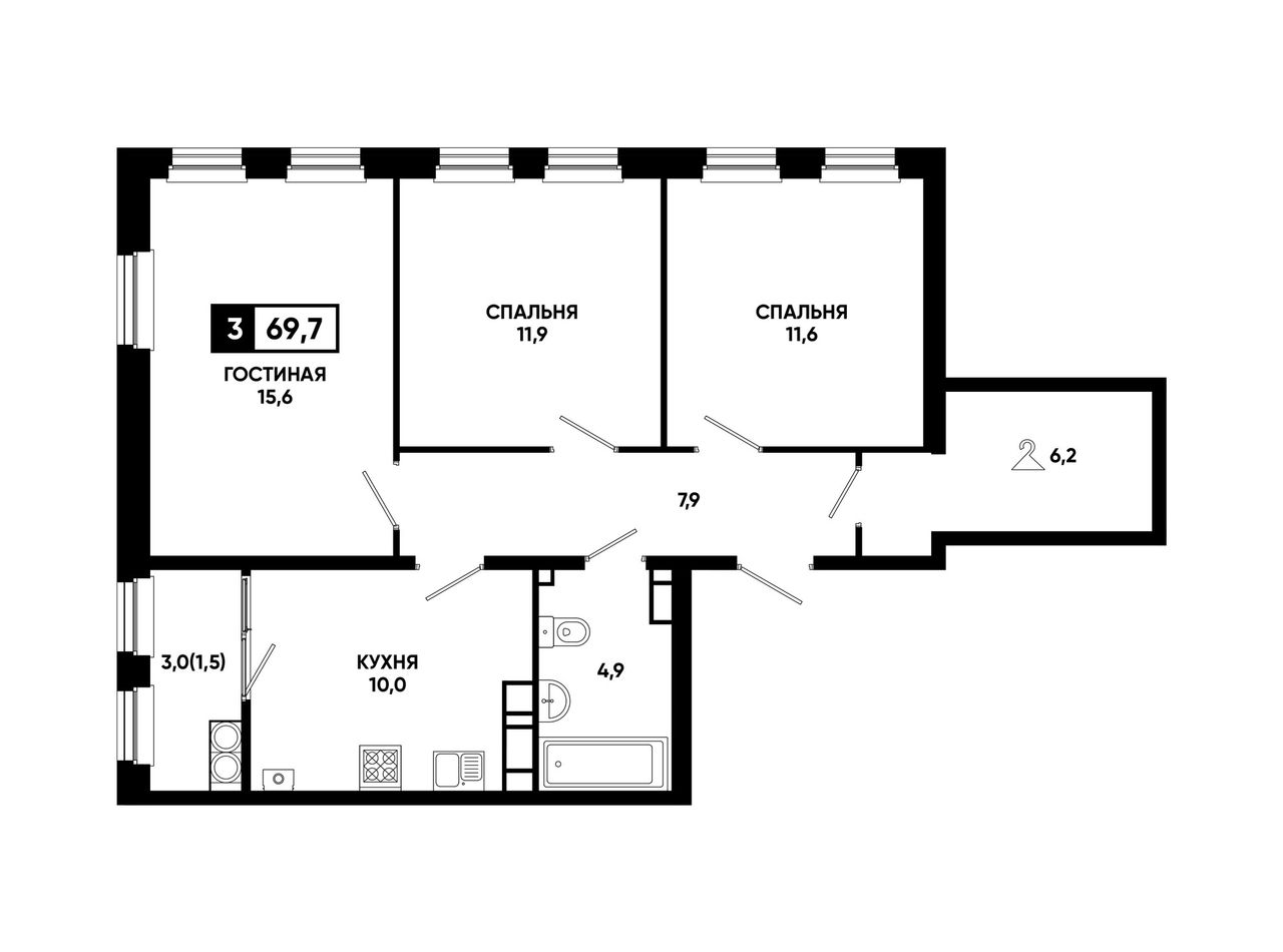 3-комнатная — 69,7 м² 15/24 эт. в Резиденция Софи