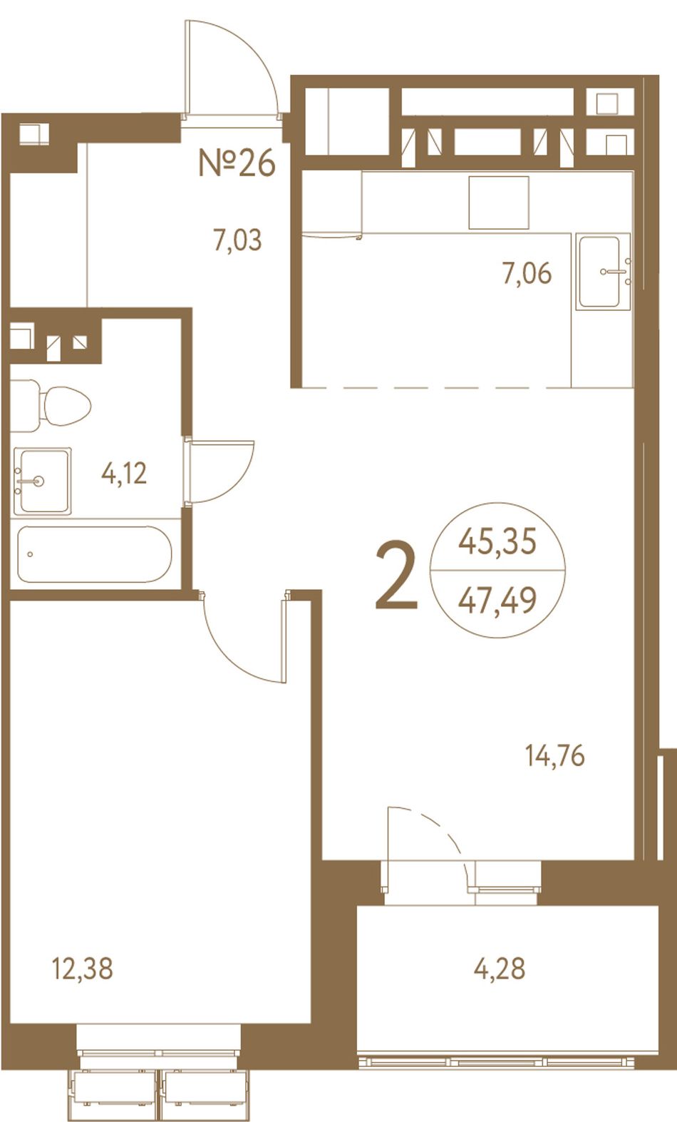 2-комнатная — 48,2 м² 3/8 эт. в Белая Вилла