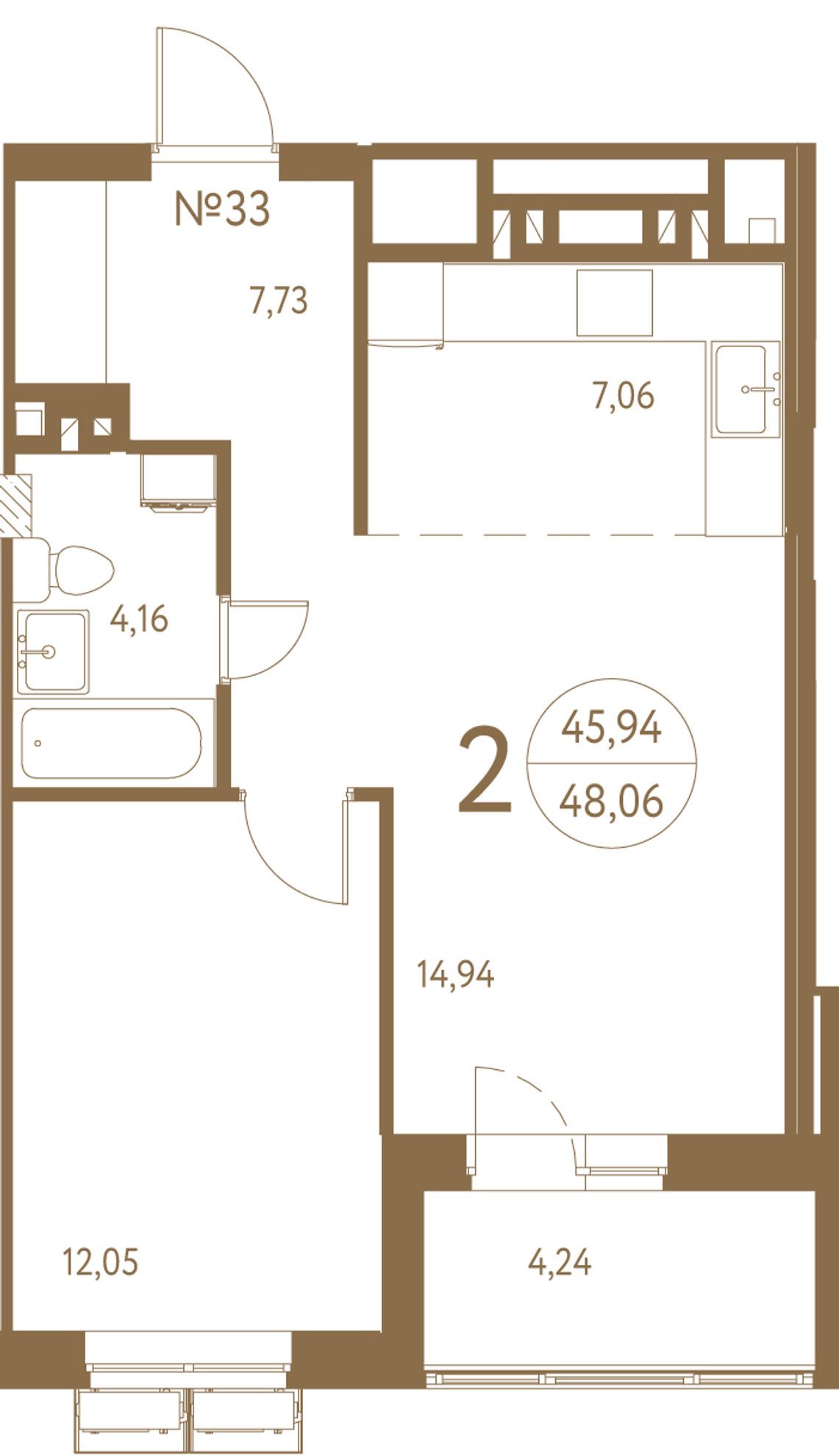 2-комнатная — 48,5 м² 4/8 эт. в Белая Вилла