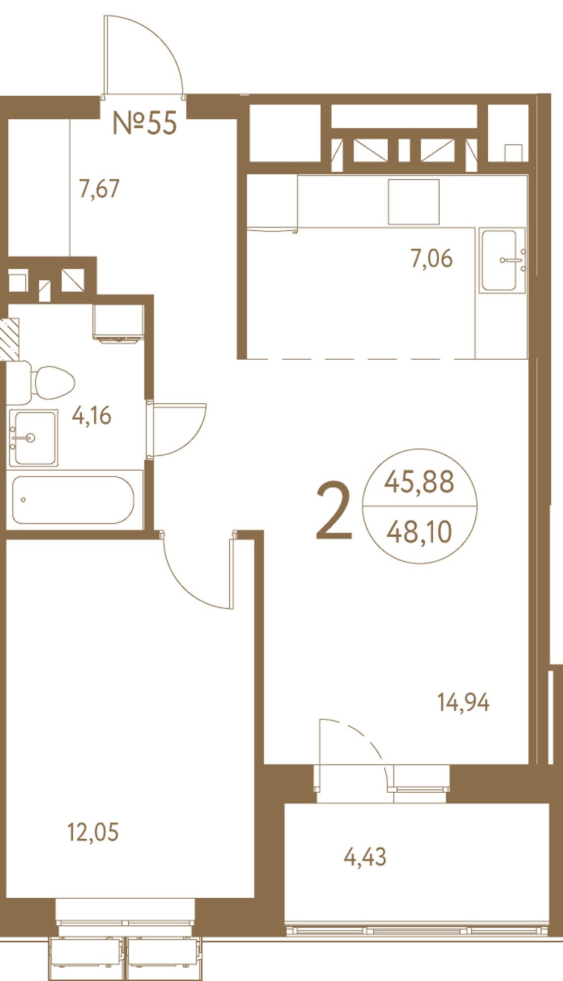 2-комнатная — 48,5 м² 6/8 эт. в Белая Вилла