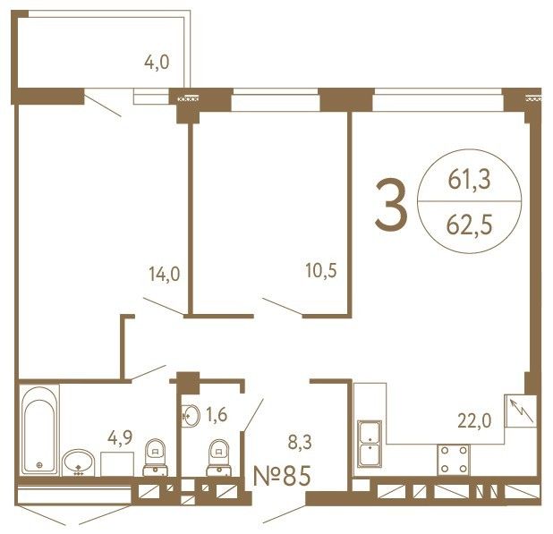 3-комнатная — 62,5 м² 12/16 эт. в Дом на 16-линии, 46