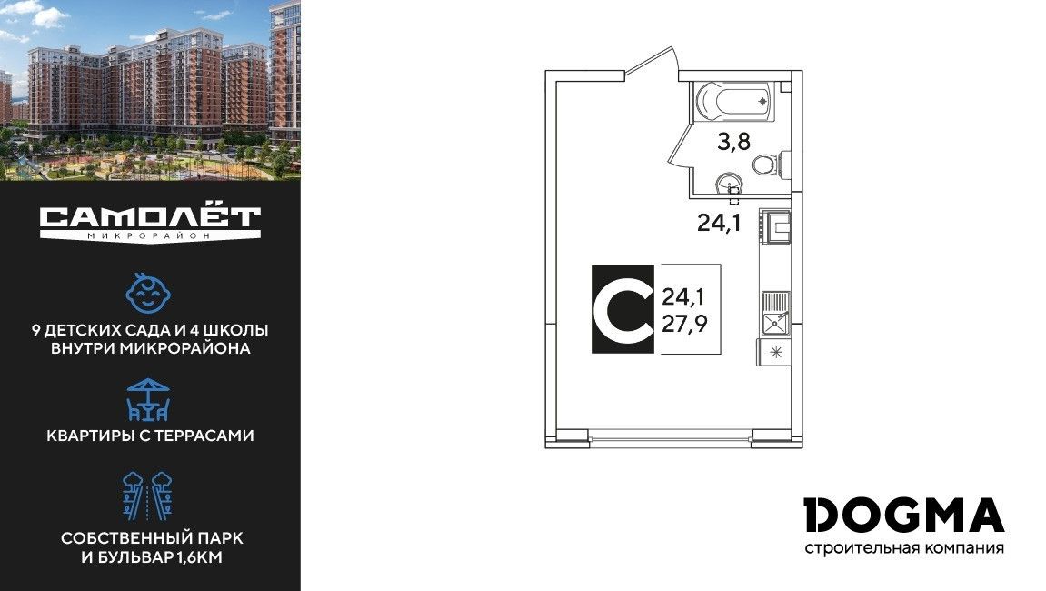 Студия — 27,9 м² 2/16 эт. в Самолёт