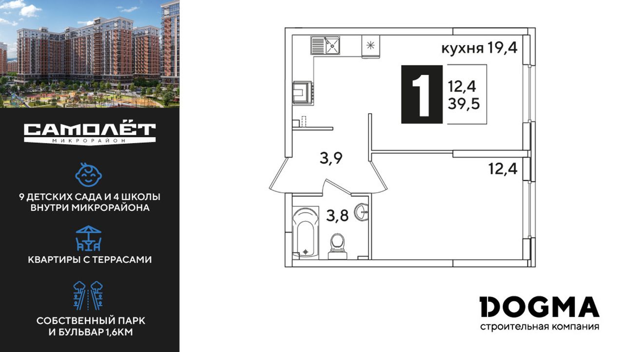 1-комнатная — 39,5 м² 2/16 эт. в Самолёт