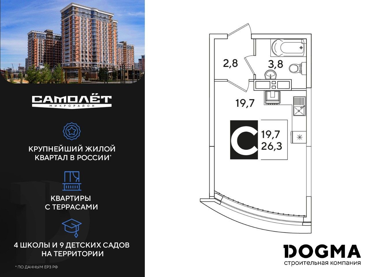 Студия — 26,3 м² 14/16 эт. в Самолёт