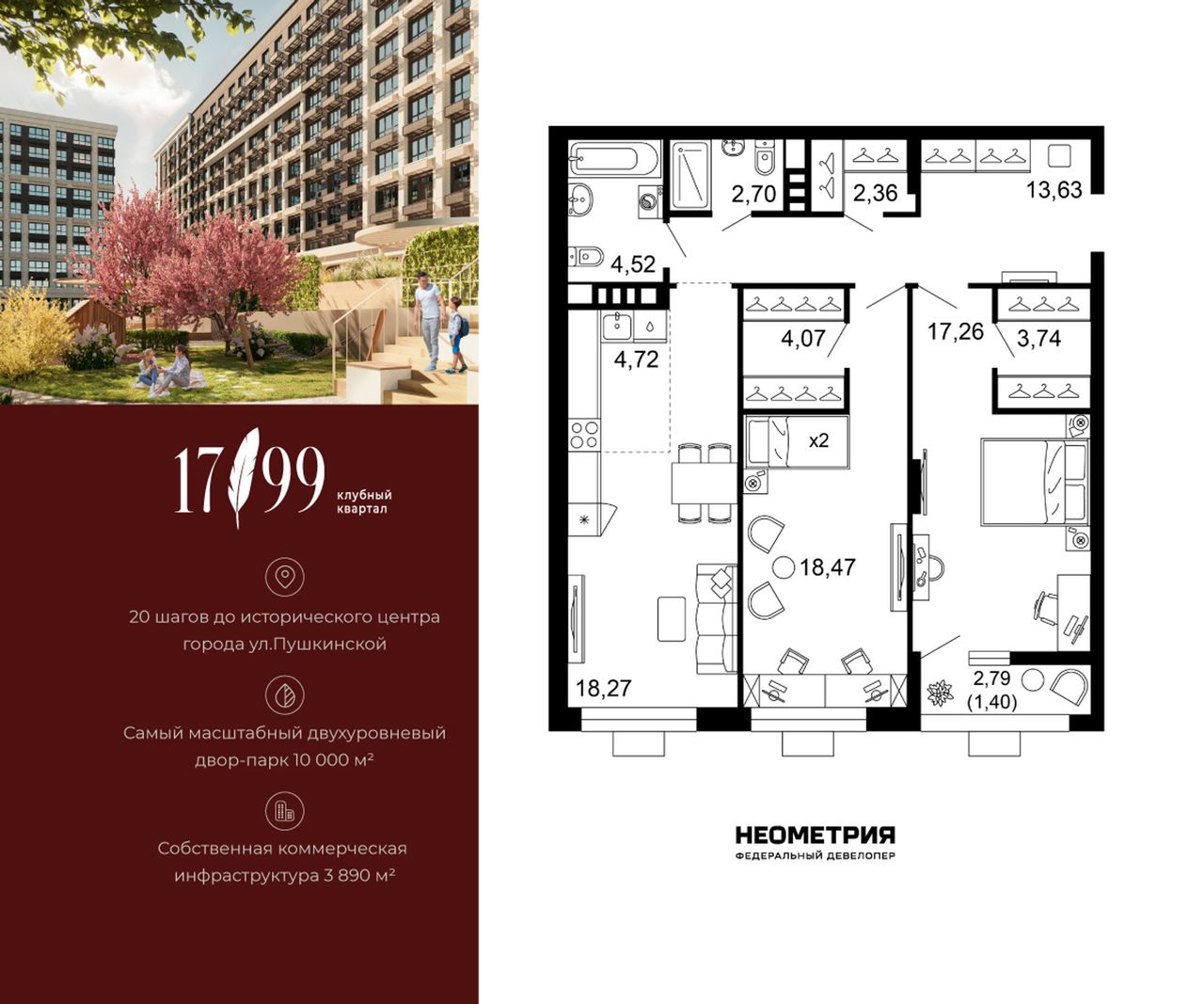 Продается квартира в клубном квартале «1799». Это истинный бизнес-класс в историческом центре Ростова. Особое сочетание уникальной локации и среды, где хочется создавать ту жизнь, которая подходит вам. Где каждое мгновение становится частью семейной коллекции лучших моментов.