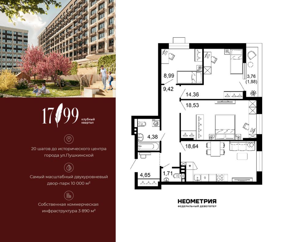 Продается квартира в клубном квартале «1799». Это истинный бизнес-класс в историческом центре Ростова. Особое сочетание уникальной локации и среды, где хочется создавать ту жизнь, которая подходит вам. Где каждое мгновение становится частью семейной коллекции лучших моментов.