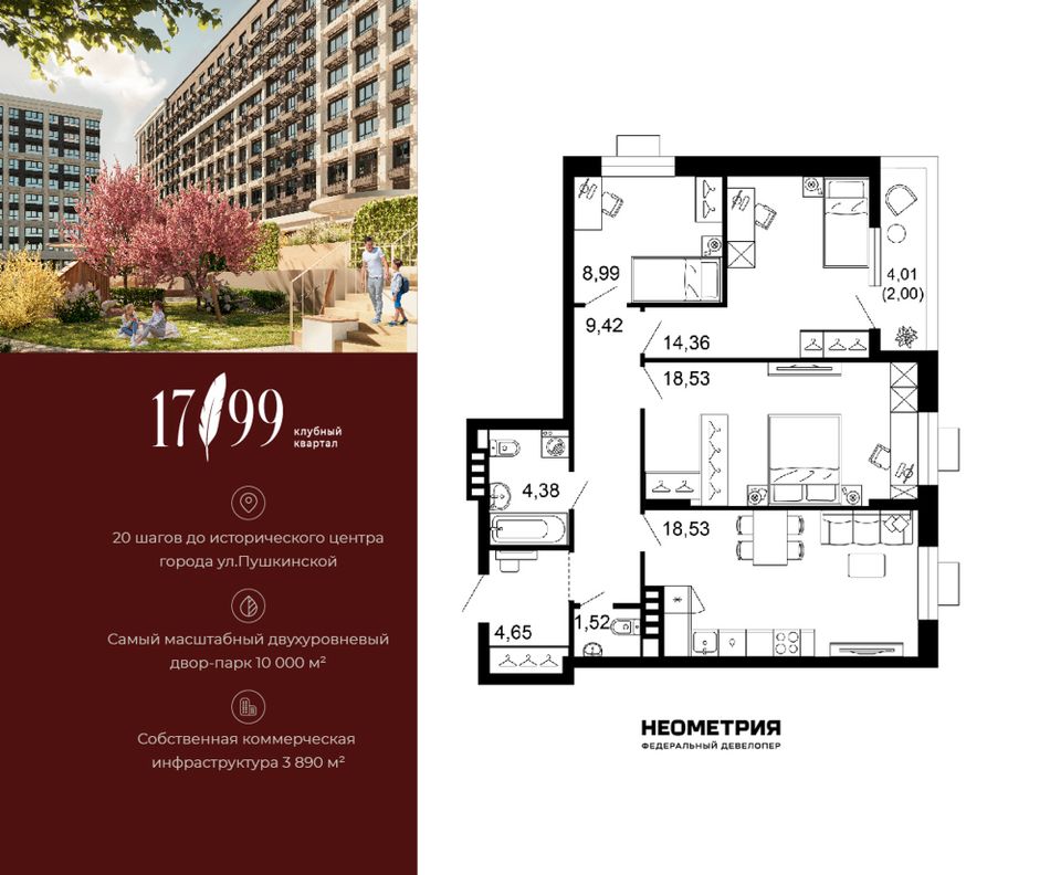 Продается квартира в клубном квартале «1799». Это истинный бизнес-класс в историческом центре Ростова. Особое сочетание уникальной локации и среды, где хочется создавать ту жизнь, которая подходит вам. Где каждое мгновение становится частью семейной коллекции лучших моментов.