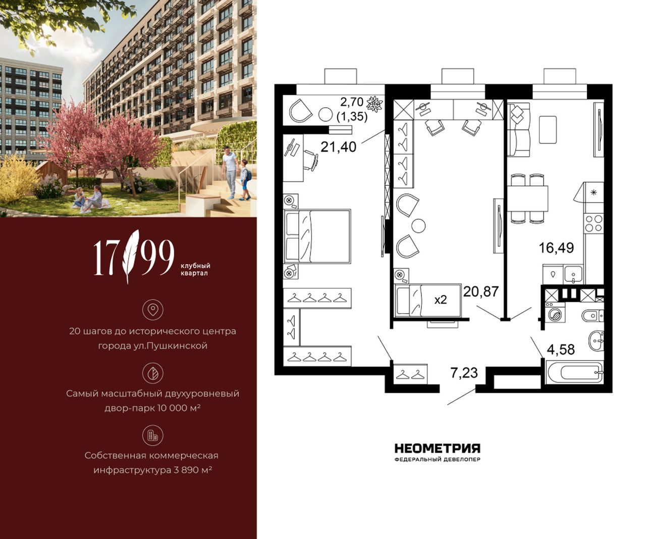 Продается квартира в клубном квартале «1799». Это истинный бизнес-класс в историческом центре Ростова. Особое сочетание уникальной локации и среды, где хочется создавать ту жизнь, которая подходит вам. Где каждое мгновение становится частью семейной коллекции лучших моментов.