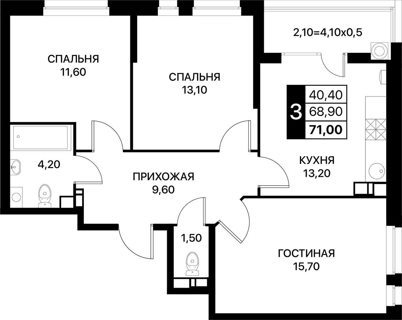 3-комнатная — 71 м² 9/14 эт. в Персона