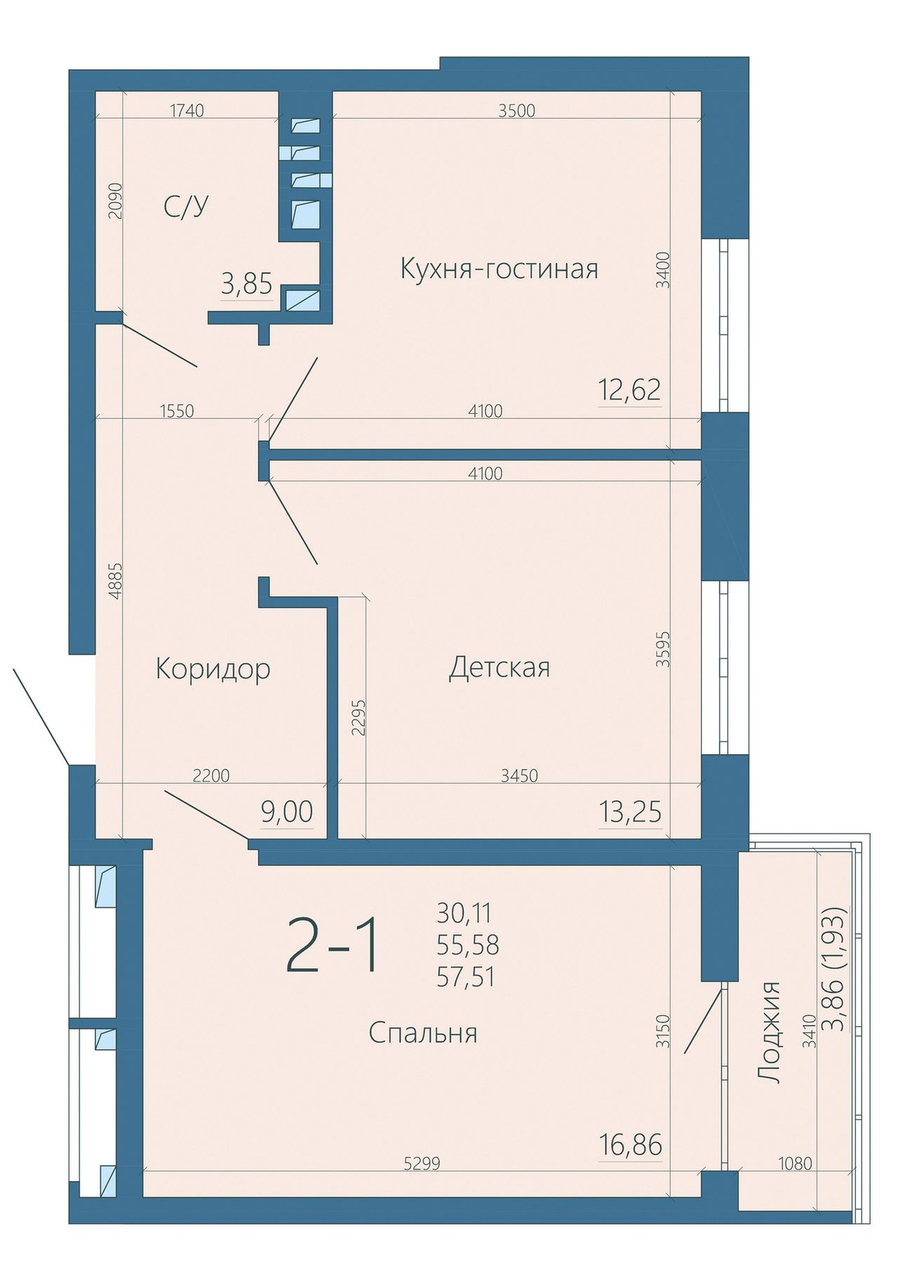 Общая площадь57,3 м²