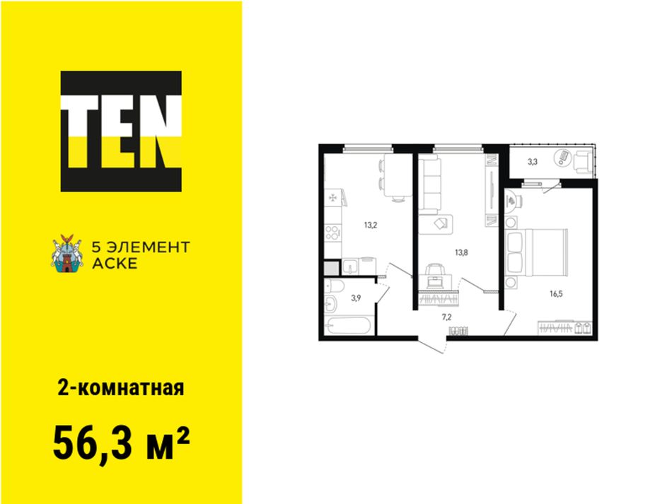 2-комнатная — 56,3 м² 2/16 эт. в 5 элемент Аске
