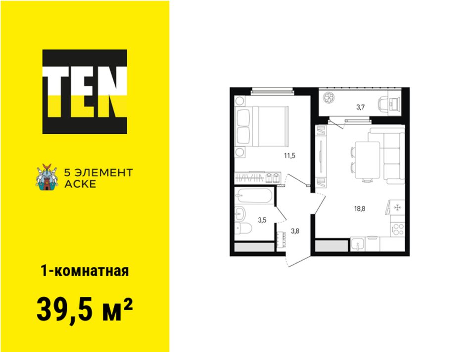 1-комнатная — 39,5 м² 3/16 эт. в 5 элемент Аске