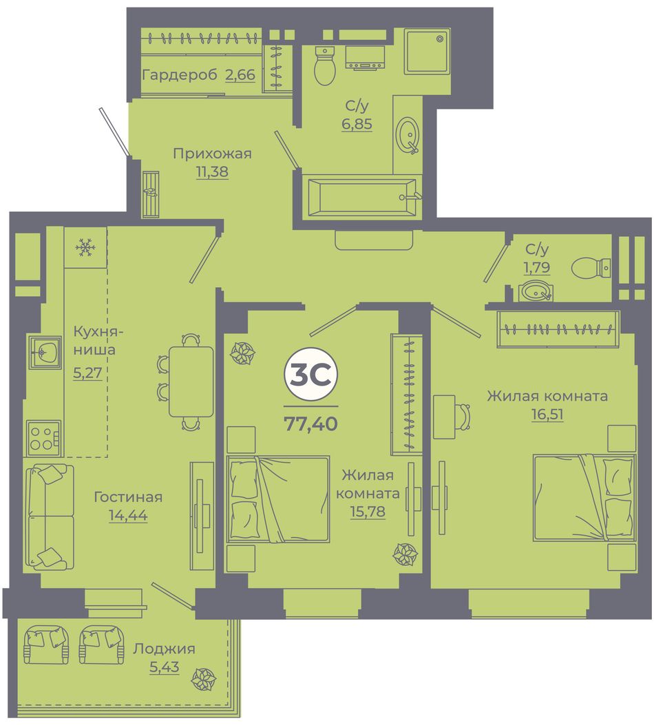 3-комнатная — 77,02 м² 22/24 эт. в Сокольники