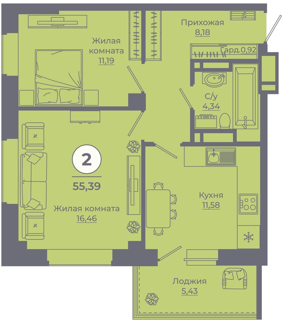 2-комнатная — 55,04 м² 22/24 эт. в Сокольники