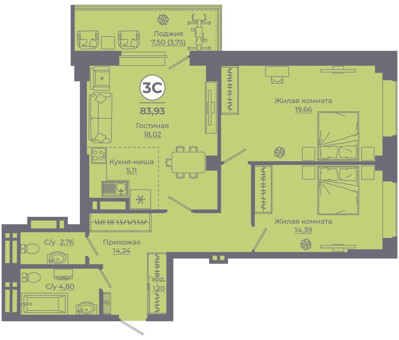 3-комнатная — 84,27 м² 8/24 эт. в Сокольники