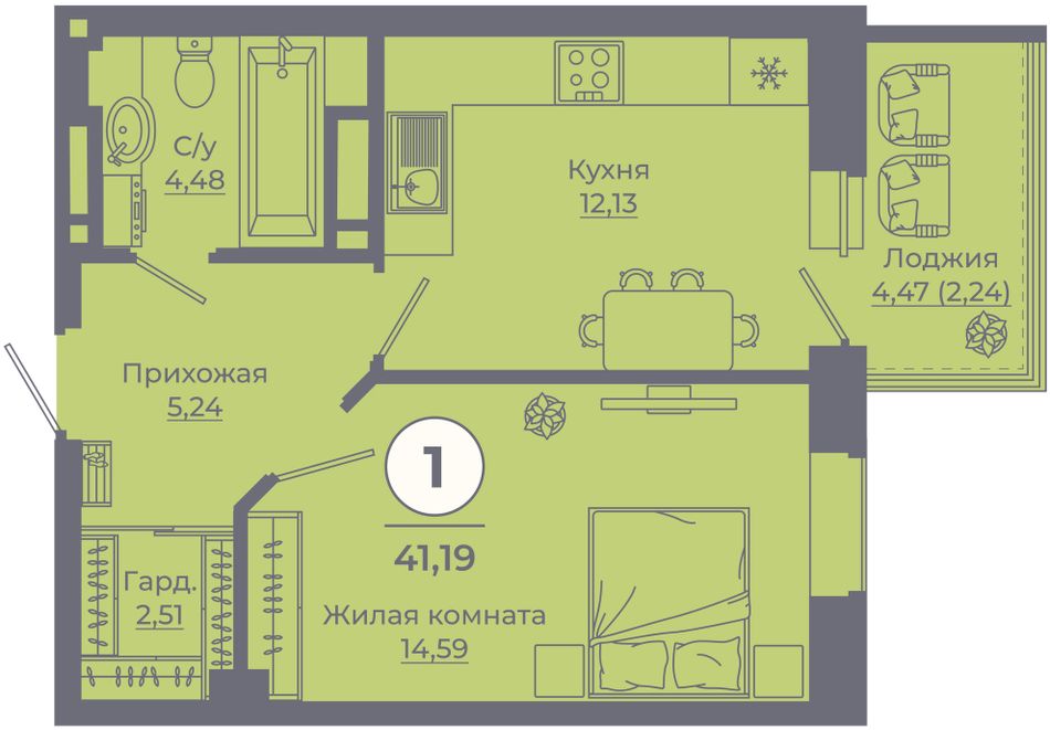 1-комнатная — 41,19 м² 13/24 эт. в Сокольники