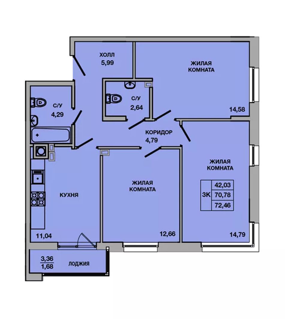 3-комнатная — 72,46 м² 8/8 эт. в Пальмира 2.0
