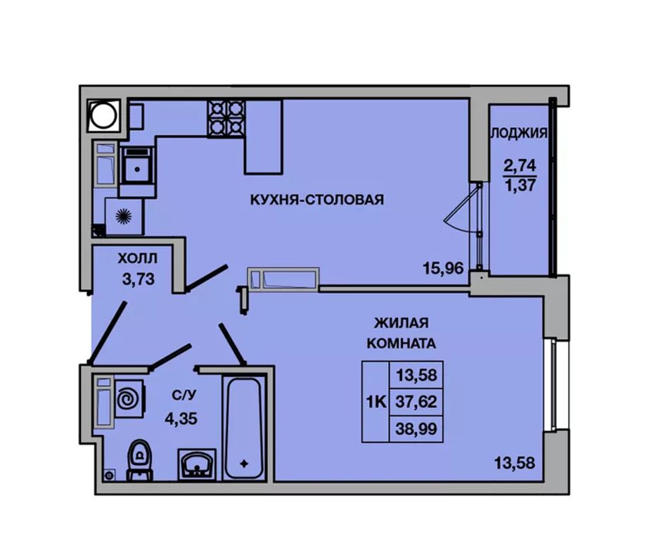 Общая площадь38,99 м²