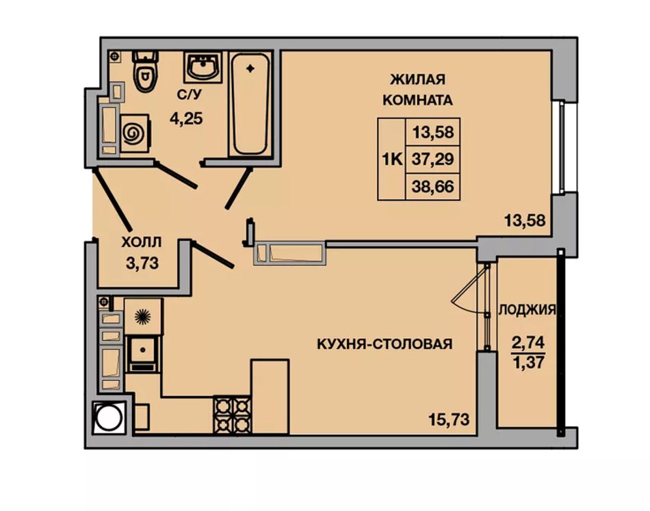 Общая площадь38,66 м²