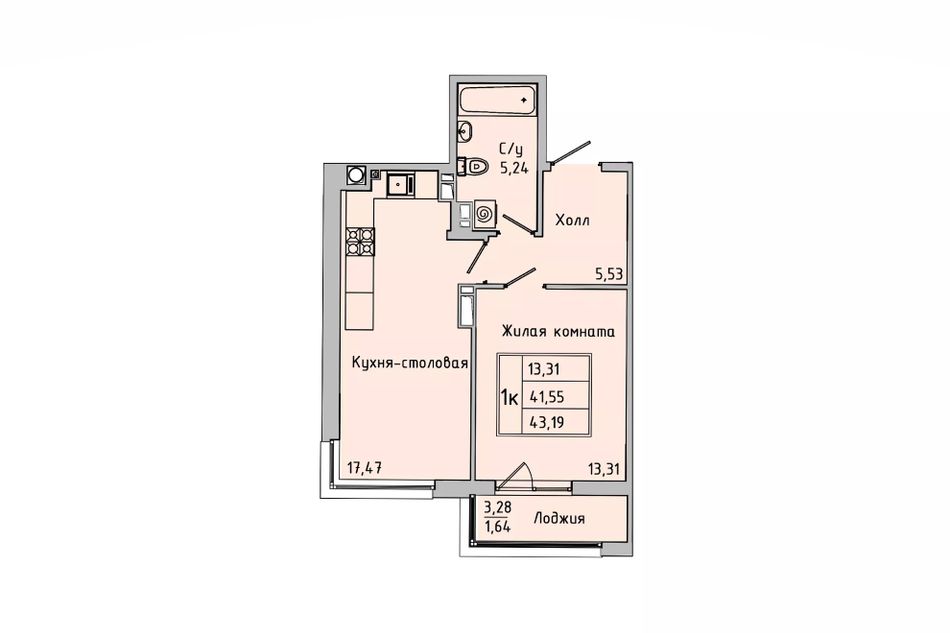 1-комнатная — 41,5 м² 3/7 эт. в Пальмира 2.0