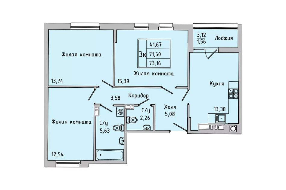 3-комнатная — 71,6 м² 6/7 эт. в Пальмира 2.0