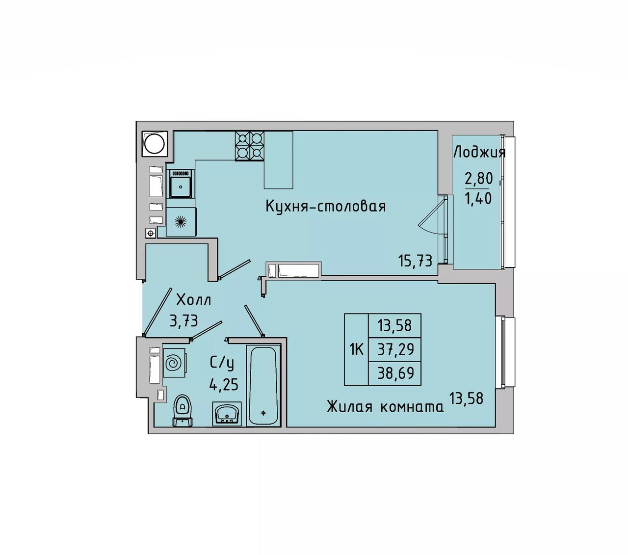 1-комнатная — 38,69 м² 10/10 эт. в Пальмира 2.0