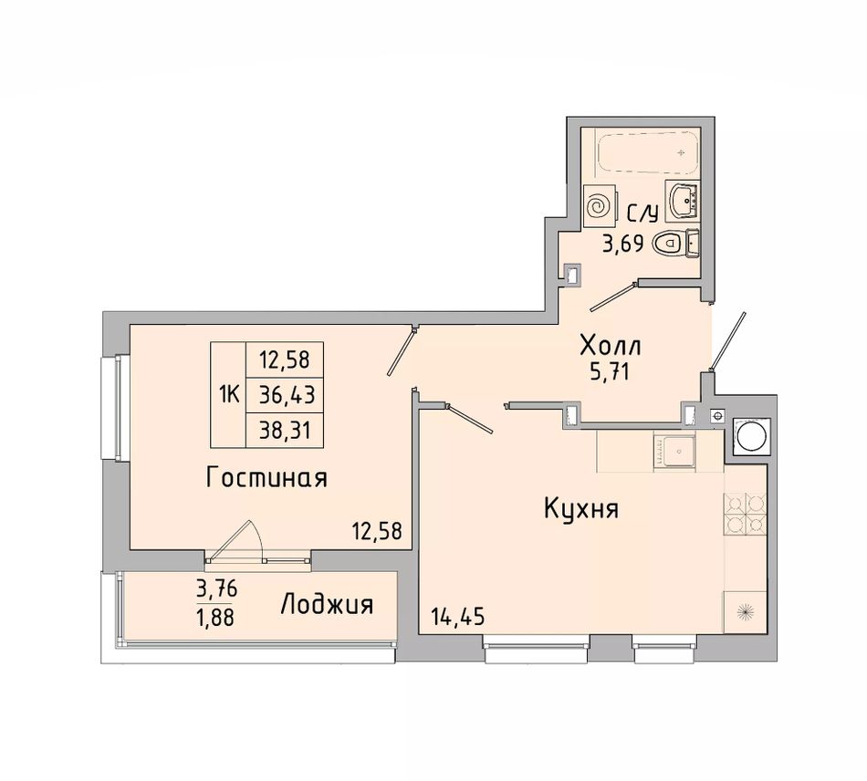 1-комнатная — 36,3 м² 1/10 эт. в Пальмира 2.0