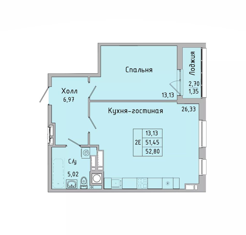 2-комнатная — 51,5 м² 2/10 эт. в Пальмира 2.0