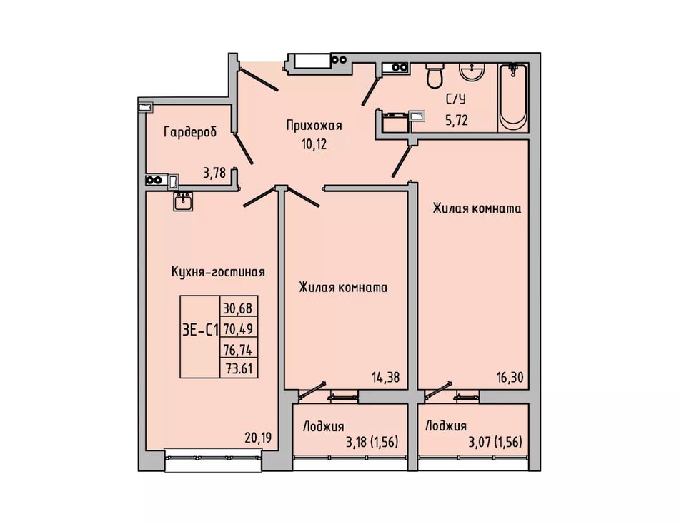 3-комнатная — 73,61 м² 1/23 эт. в Лýна