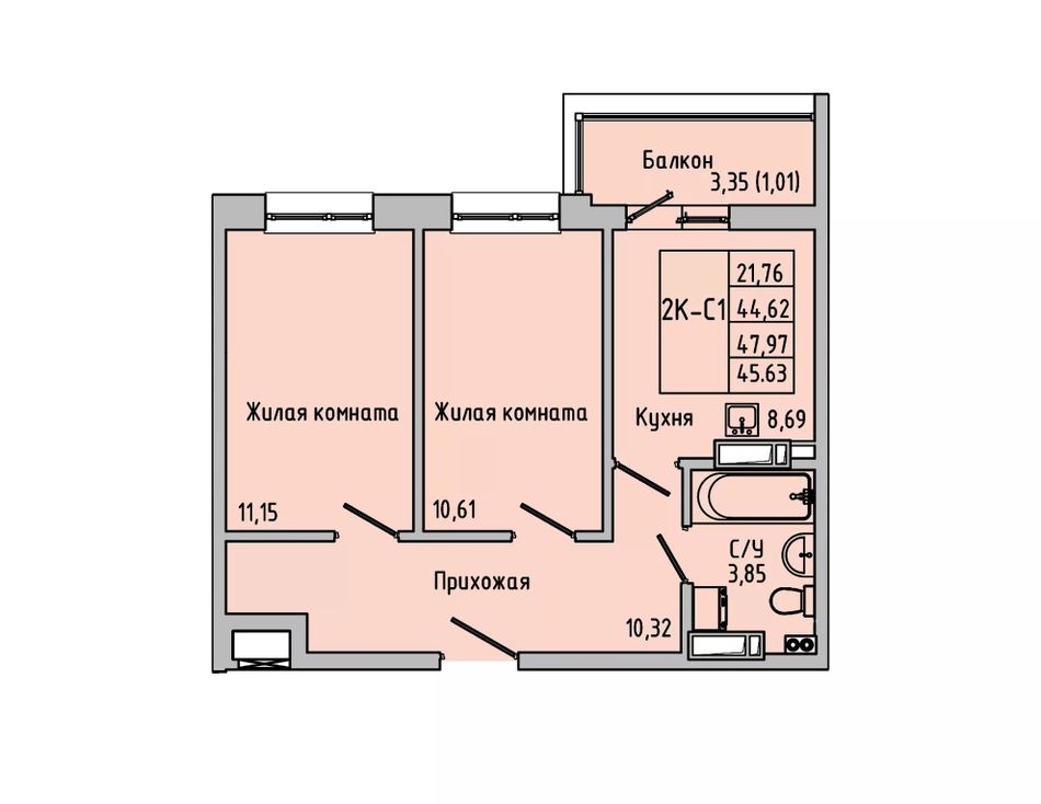 2-комнатная — 45,63 м² 2/23 эт. в Лýна