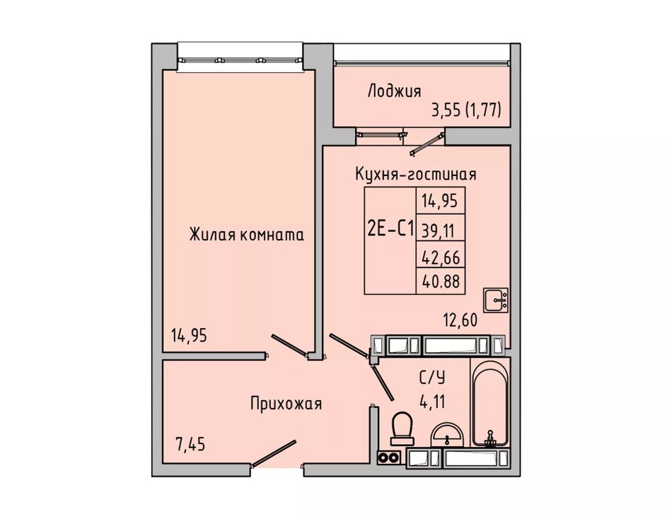 2-комнатная — 40,88 м² 15/23 эт. в Лýна