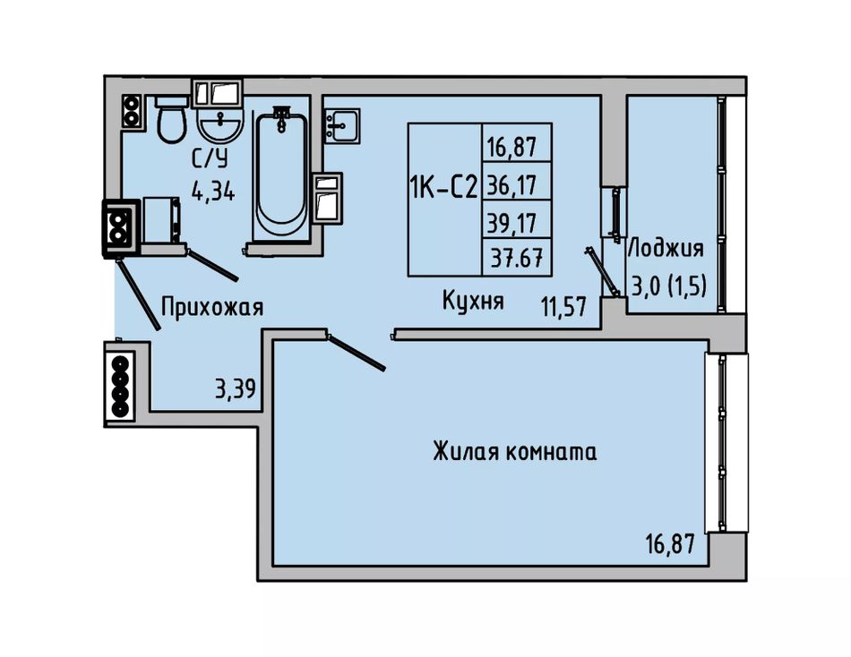 1-комнатная — 37,67 м² 2/23 эт. в Лýна
