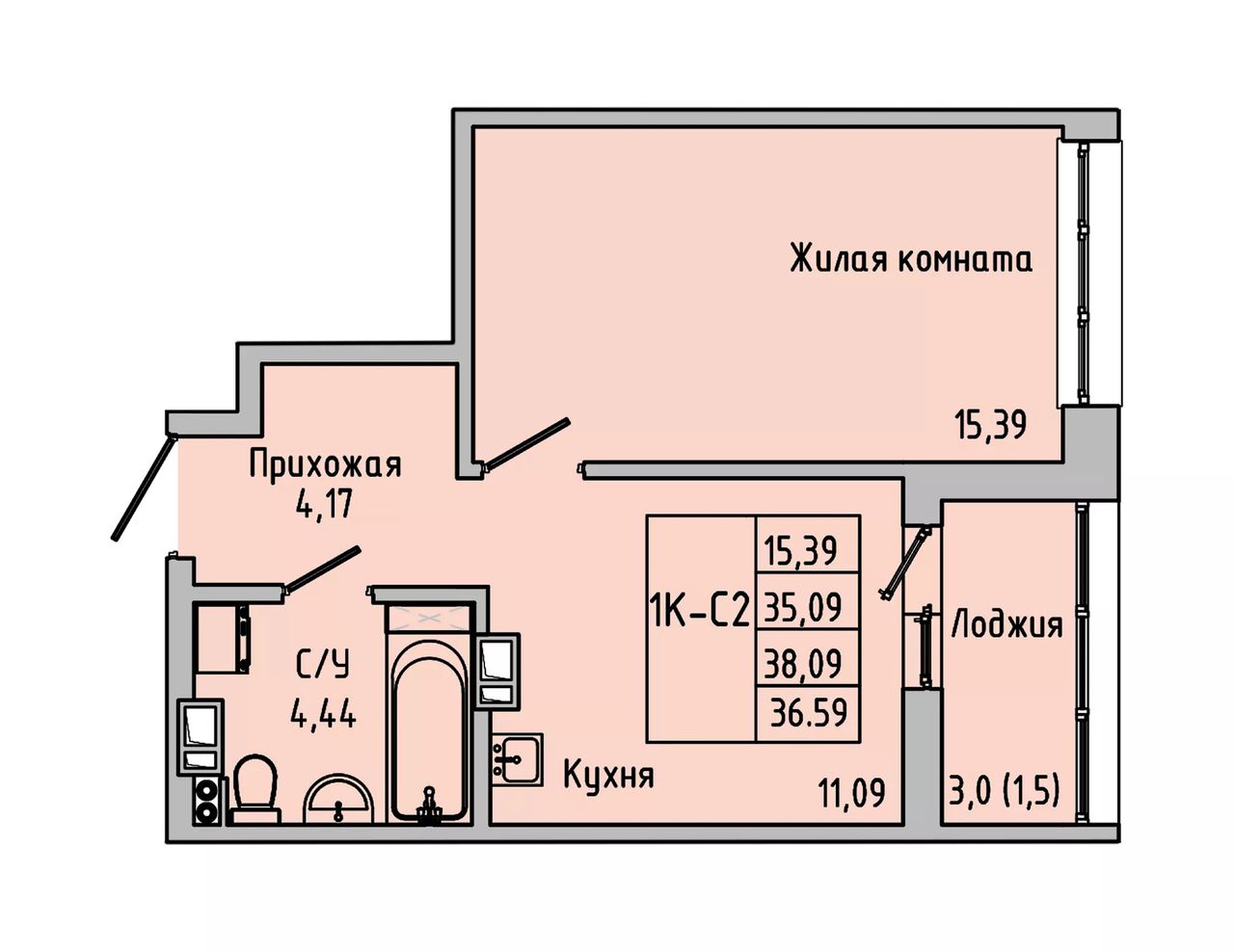 1-комнатная — 36,59 м² 3/23 эт. в Лýна