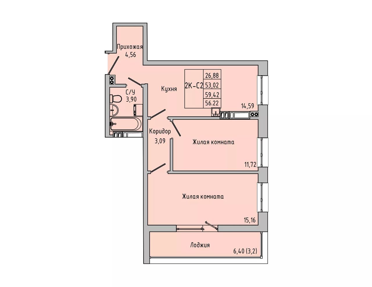 2-комнатная — 56,22 м² 15/23 эт. в Лýна