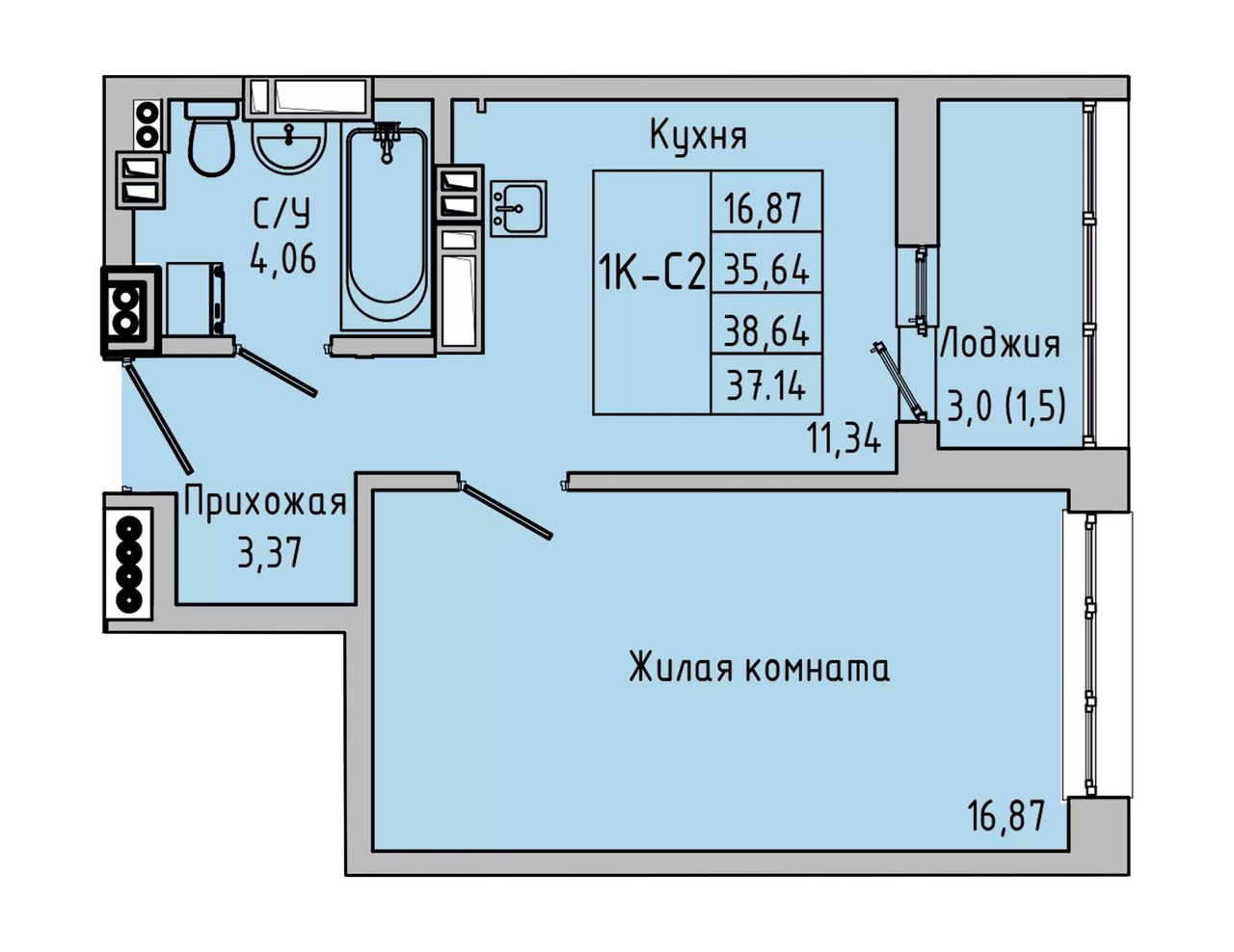 1-комнатная — 37,14 м² 15/23 эт. в Лýна