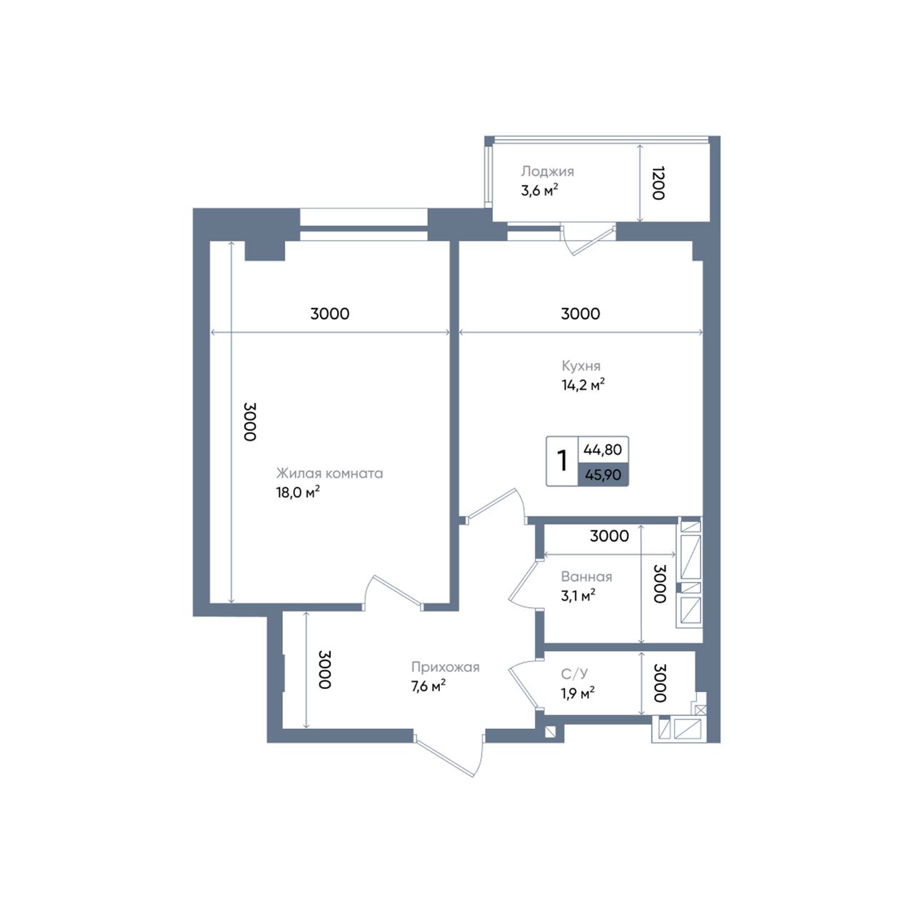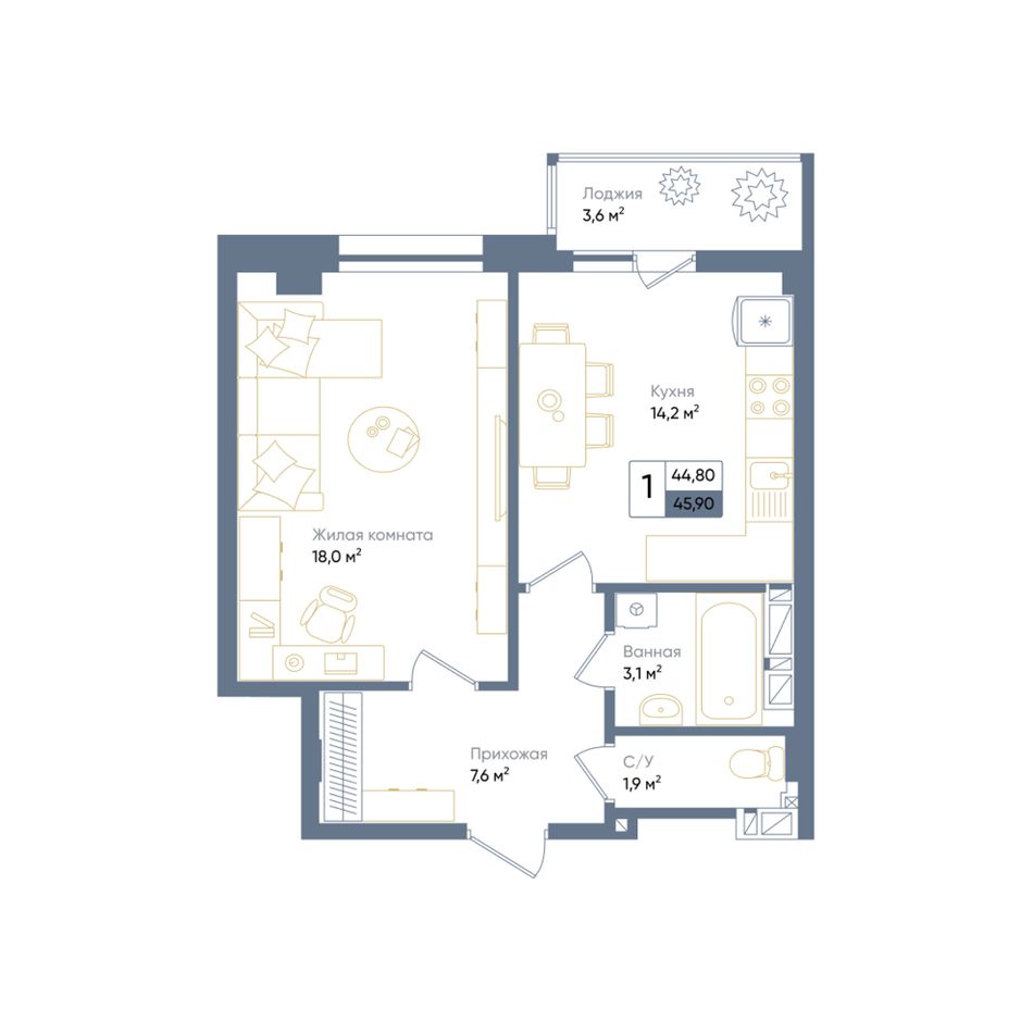 1-комнатная — 47,4 м² 9/13 эт. в Times (Таймс)