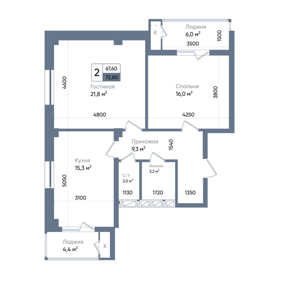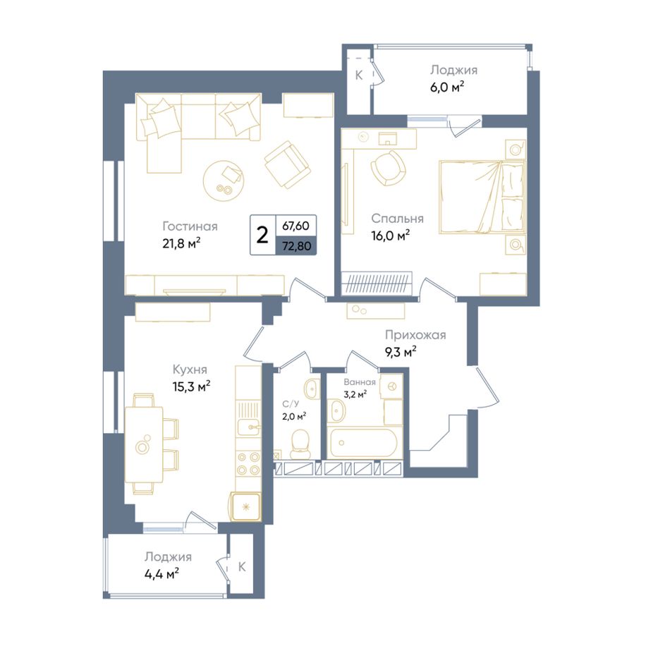2-комнатная — 74,5 м² 14/19 эт. в Times (Таймс)