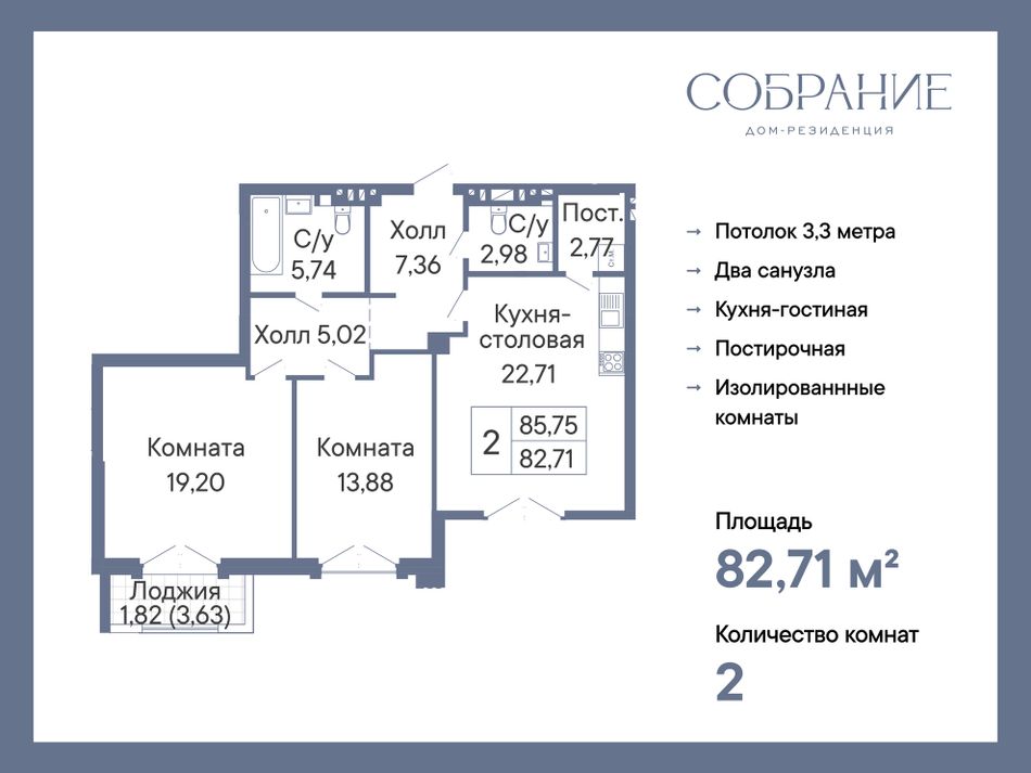 2-комнатная — 82,71 м² 4/7 эт. в Дом-Резиденция Собрание