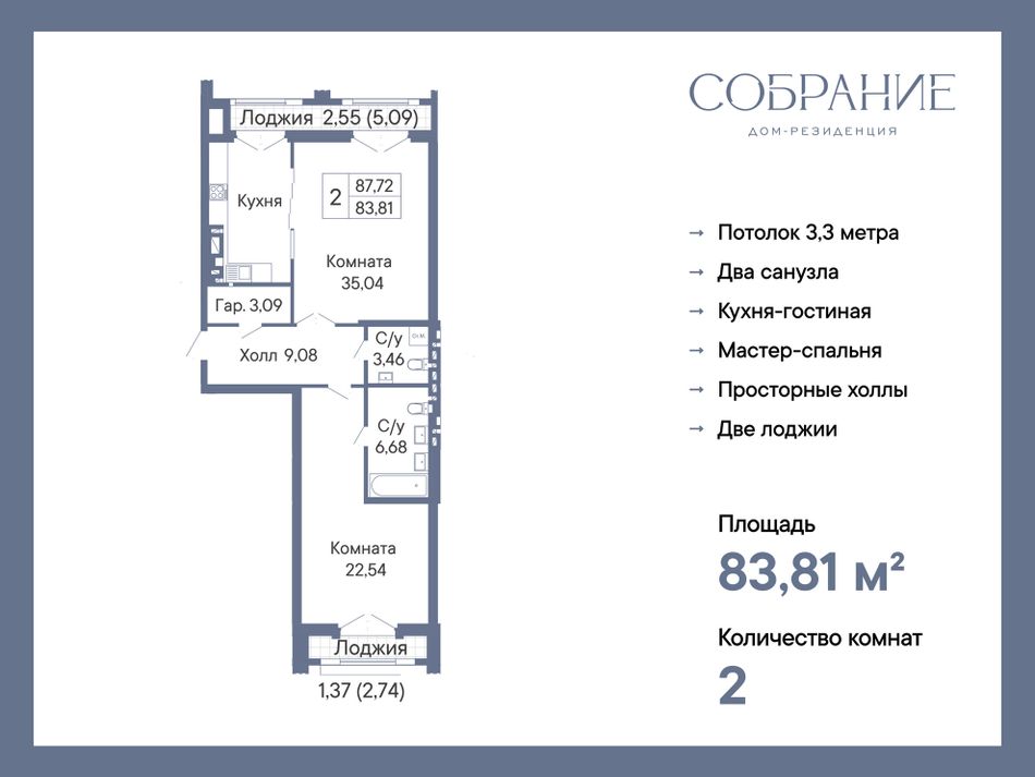 2-комнатная — 83,81 м² 5/7 эт. в Дом-Резиденция Собрание