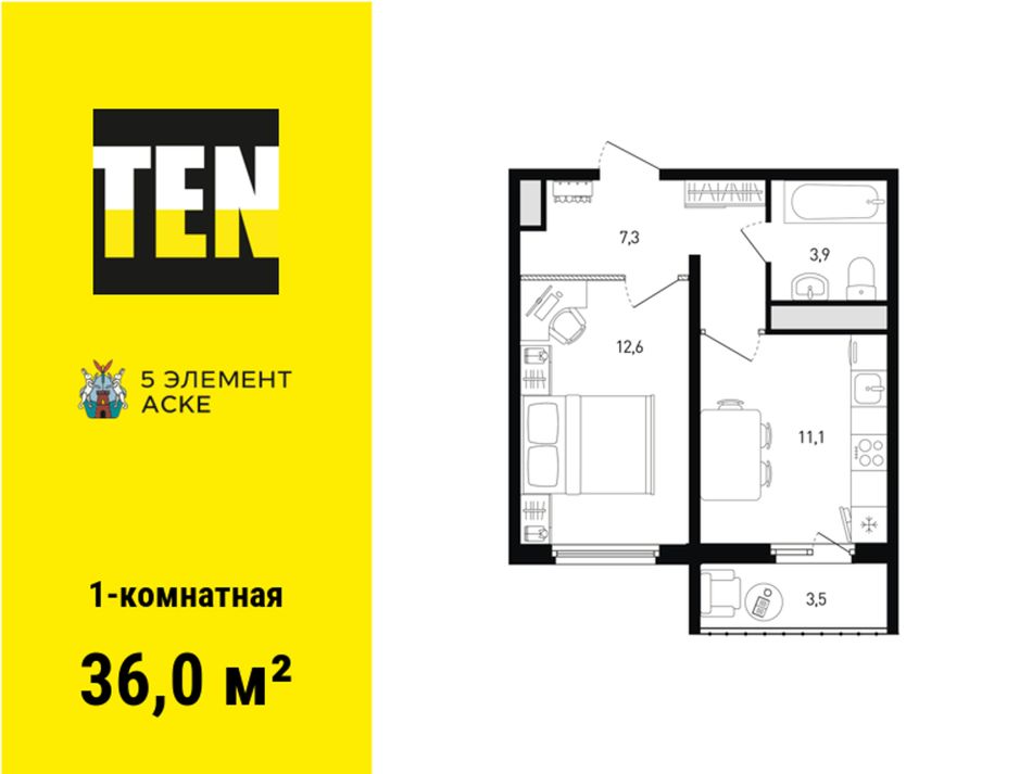 1-комнатная — 36 м² 8/16 эт. в 5 элемент Аске