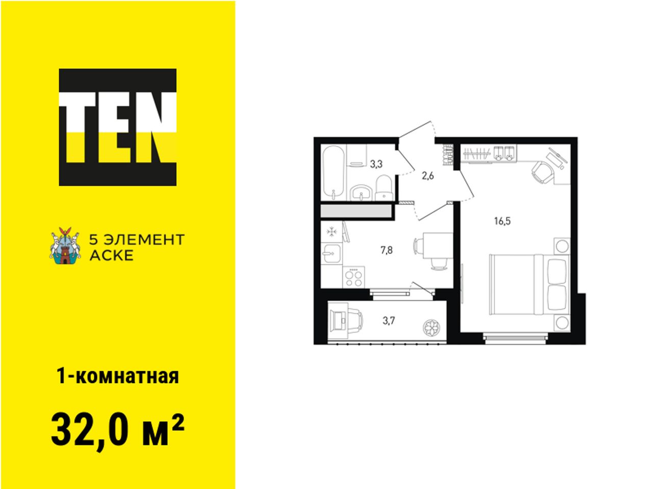 1-комнатная — 32 м² 6/16 эт. в 5 элемент Аске