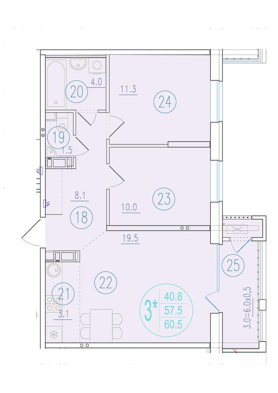 3-комнатная — 60,5 м² 11/23 эт. в Состояние